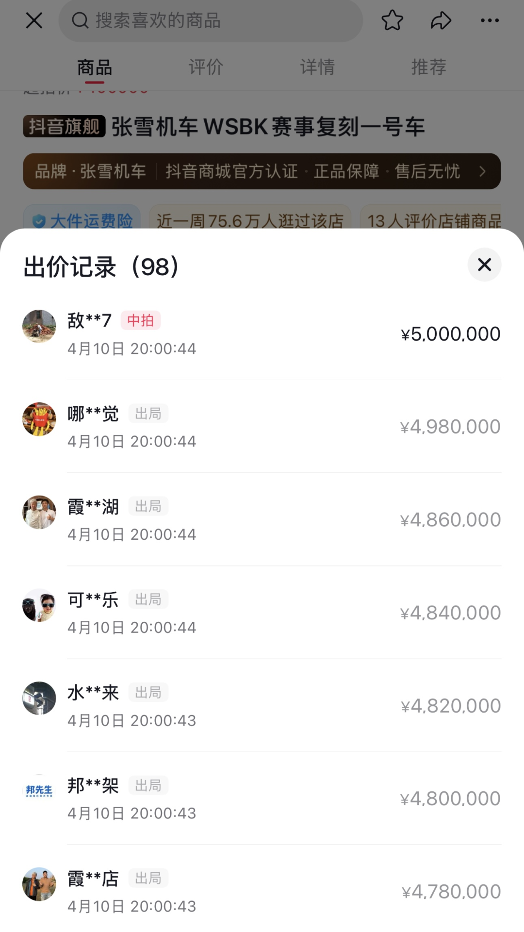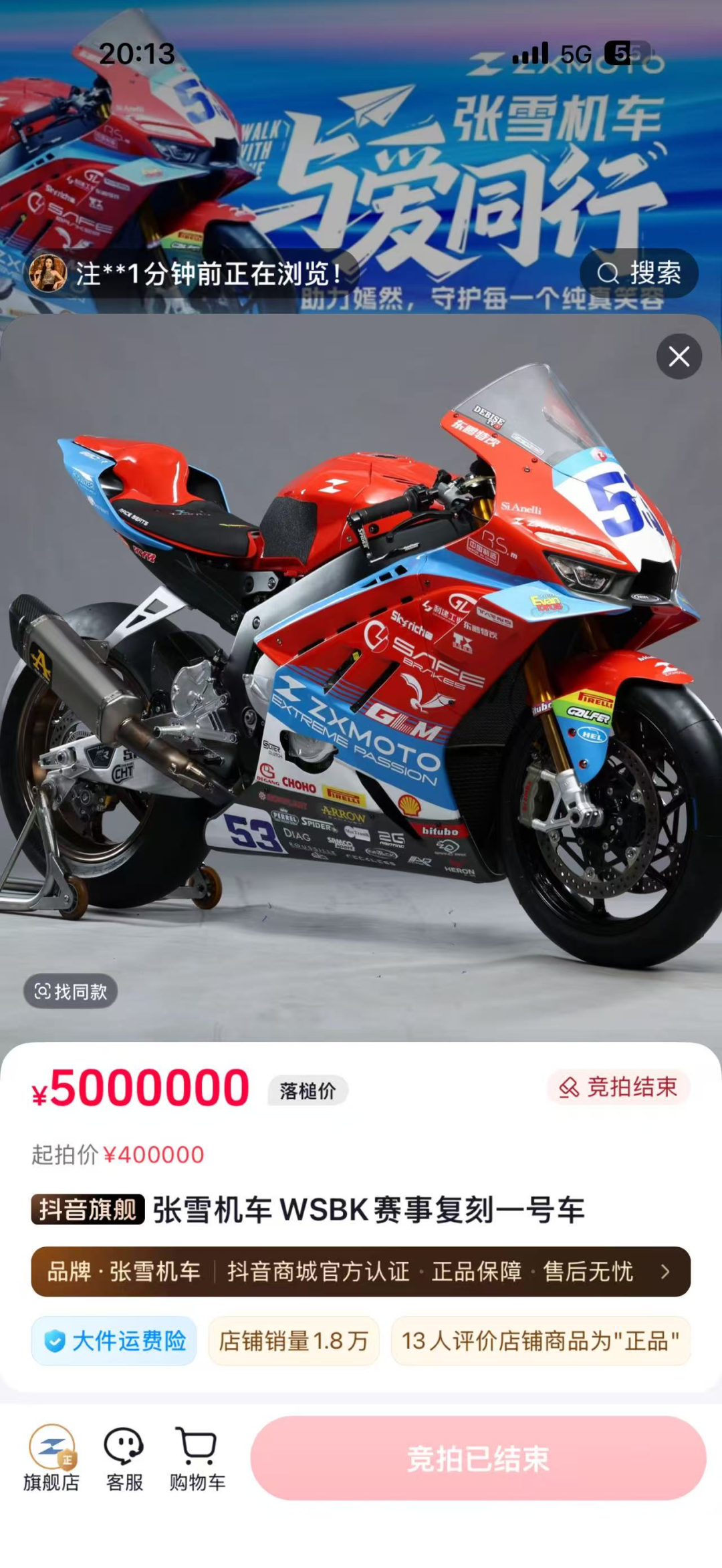 4月10日晚8时,张雪机车账号开启直播,开动拍卖WSBK夺冠车53号复刻版,据10日中午,张雪机车账号发布视频示意,这次拍卖夺冠车型复刻版,建树拍卖金额上限500万元。但竞拍者不成一次性出价到500万,在涨价到100万以后,单次只可涨价固定金额,因此谁能开头触达封顶价有一定的运说念要素。